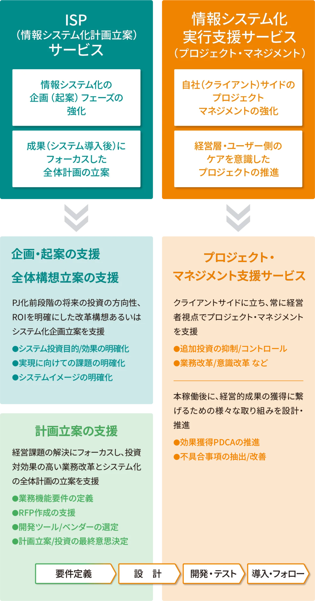 システムに関わる様々な課題の調査・分析を実施し、改善アプローチをご提案。初動から支援実行までのフローを、チャートでご紹介します。