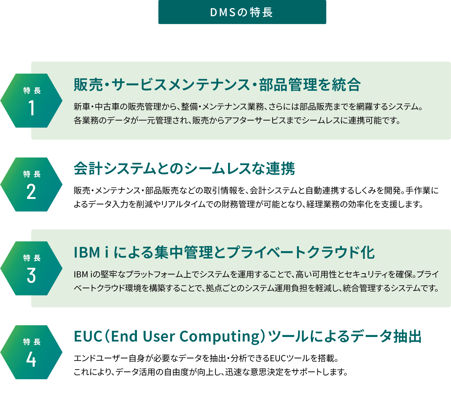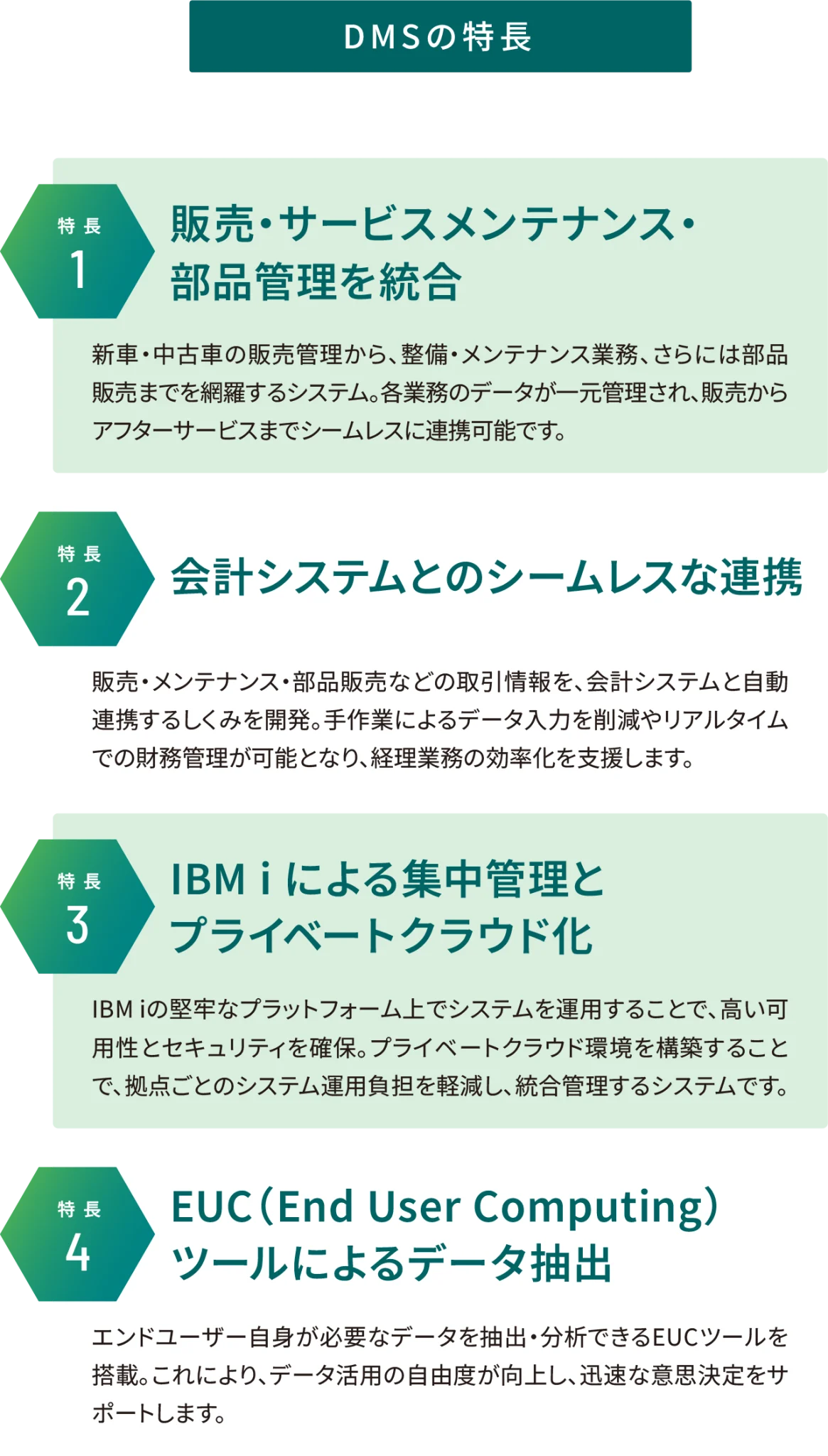 自動車ディーラーの業務に特化し、新車・中古車の販売管理、サービスメンテナンス、部品販売業務を統合的に管理し、業務効率化と精度向上を実現。